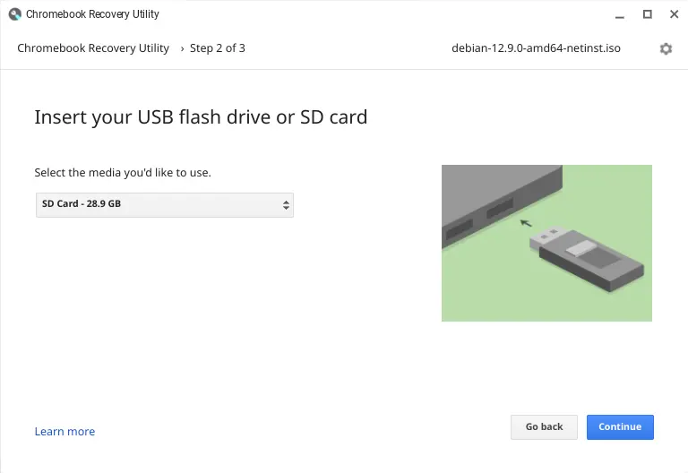 3) Select the USB Flash Drive, MicroSD Card or Full Sized SD Card from the media drop down. Please note that this will show any external media device you have connected to your ChromeOS Device, so please take a moment to ensure you are selecting the correct device.