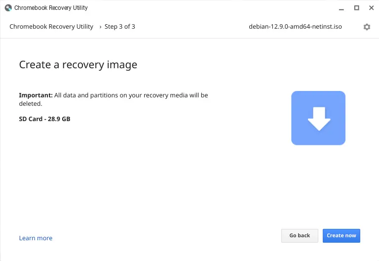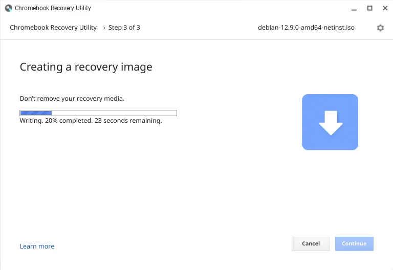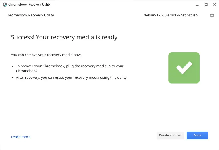 6) When the disk image has been written, you will be prompted to remove your external media device. You may also delete your disk image file from your ChromeOS device if you need to reclaim space/