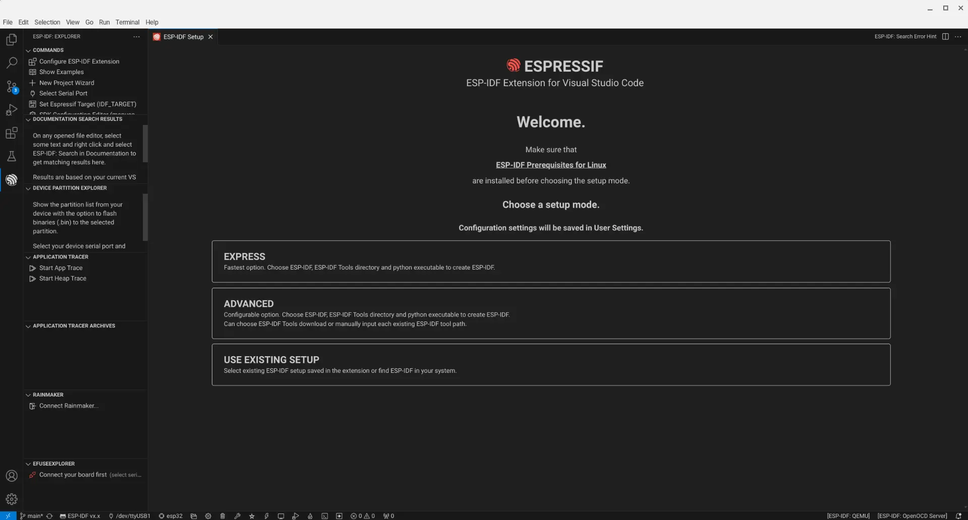 Once the ESP32 VSCode Extension has been installed, Launch VSCode and select the ESP-IDF Extension to complete the setup using the "Express" option, which will perform all the steps needed to complete the setup. This process will take several minutes to complete.