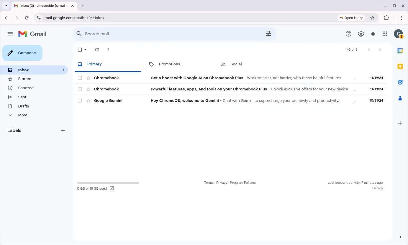 Once the GMail Application is installed, it will automatically configure itself with the Google Account used to log in to your ChromeOS Device. Once the GMail application has been configured, an initial synchronization will be started, which may take several minutes to complete, depending on the speed of your internet connection.